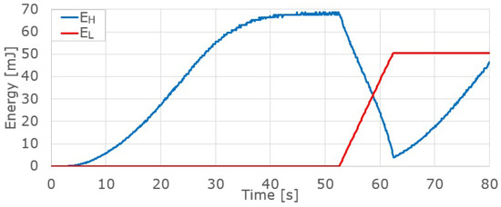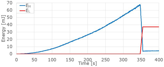 During the experiment for harvesting light energy, the ES collected 67.5 mJ of energy in 52.6 s and then supplied the load with 50.6 mJ of energy in 9.7 s. The calculated waveforms of and energy are presented in Figure 7.
