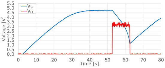 According to the physical model experiment for harvesting light energy, the voltage increased from 0 V to 4.78 V over 52.5 s. When the given amount of energy was collected in the storage, and the voltage reached the threshold value, the load was supplied with the harvested energy for 9.7 s at a mean voltage of 3.2 V. The ES maintained the required voltage of 3.2 V. The measured and voltage waveforms are presented in Figure 6.