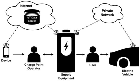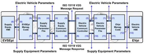 The two main solutions to this challenge could be, on the one hand, to introduce renewable energy sources (RESs), and particularly those that are generated at the distribution level, reducing the need for conventional energy sources, and, on the other hand, the introduction of demand response mechanisms that allow for adjusting the charging power of EVs according to the power output from these RESs. Through this mechanism, known as smart charging, EVs can minimize the requirements they place on electrical grids by shaping their demand pattern, varying their power intensity and charging periods [,,]. At this level, EVs can be thought of as additional storage units either for the sole purpose of mobility or to support vehicle-to-grid (V2G) energy transfers []. In both cases, interoperability mechanisms between an EV and electric vehicle supply equipment (EVSE) are needed. One of the challenges associated with the implementation of grid-to-vehicle and V2G energy transfers is the limited capacity for exchanging information between the EV and the EVSE. Currently, most of this information exchange is performed via low-level control mechanisms (IEC 61851-1 []), through the control pilot and proximity pilot-signaling pins. Mostly used in the alternating current (AC) power transfer mode, the signaling carried out through these pins only indicates when the EV is connected to the EVSE and what the available electrical current that the supply equipment can supply to the vehicle is. That reduced set of control options limits the implementation of smart charging solutions [,,].