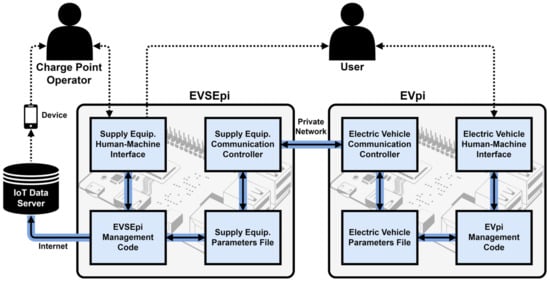 The charging emulation system is divided into two main modules represented in Figure 4, the EVSEpi on the left side and the EVpi on the right side. Each one of these modules is divided into four sub-modules that support the implementation of similar functions at both ends, namely the communication controller, the parameter file, the management code, and the HMI. Each module was implemented on a dedicated Raspberry Pi (version 3—Model B).