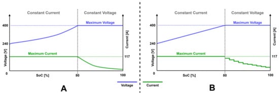 One of the main objectives of the EVpi management code is to control the charging process of the EV battery. This approach allows for the definition of batteries with different characteristics in the EVpi management code. The charging process of an EV Li-ion battery applies both the constant-current (CC) and constant-voltage (CV) charging techniques, known as the CC-CV strategy. The CC-CV strategy consists of dividing the charging process into the two charging techniques [,]. Graph A of Figure 5 illustrates the voltage and current behavior during a full charge over time using the CC-CV charging strategy.