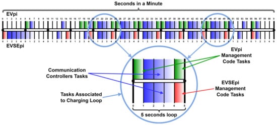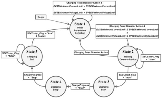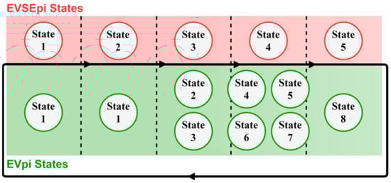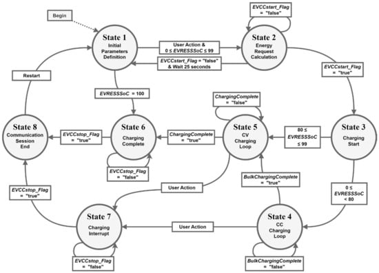 Figure 8 illustrates how the states of each module (EVpi and EVSEpi) are combined to make the implemented system work. During the system’s operation, each EVSEpi state is associated with one or more states at the EVpi. However, at any given instant, only a one-by-one association might exist. For example, State 4 of the EVSEpi is related to States 4, 5, 6, and 7 of the EVpi, but no more than one of these four states can exist at the same time. So, if the EV is charging using the CC charging-loop technique, both the EVpi and the EVSEpi should be in State 4.