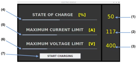 When button (7) in Figure 9 is pressed, the EV’s HMI presents a new interface with the EV’s charging screen (shown in Figure 10). This interface allows for the monitoring of all the parameters of the EVpi management code states (except for the first state). In it, the user can observe the information associated with the status of both the charging process and the communication session.