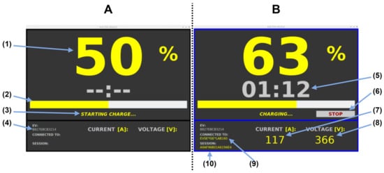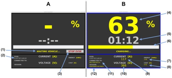 EVSE’s charging screen. When the charging process has not yet started, only some information is made available at the EVSE charging screen (A), such as the information bar (1) and the EVSE identifier (2). It also includes a stop button (3) that can be used by the CPO only during this stage, allowing the EVSE HMI to get back to the initial parameterization screen, canceling the wait for the establishment of a new communication session. Once the charging process starts (B), the remaining information on the charging screen is made available, such as the EV’s SoC (4), the time left to a full charge (5) displayed in an hour:minute format (hh:mm), the SoC level (6), the charged energy (7), the associated cost (8), the EVSE’s charging current (9) and voltage (10), the EVCC identifier (11), and the communication session identifier (12).