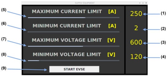 The HMIs of the EV and EVSE allow for defining the limits of the voltage and current supported for each device before the communication session starts. This way, the system allows different charging scenarios to be emulated. These interfaces also provide information about the EV’s charging status that is updated every 5 s. The HMIs were developed in the JAVA programming language with the aid of the Swing graphical user interface tool of the Netbeans IDE, and they are controlled using the associated management codes. In the following passages, we describe each one of these interfaces in the EVpi and EVSEpi.