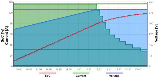 Chart of the electrical current, voltage, and SoC variables during an emulated charging process. The red line represents the SoC as a percentage, the green line represents the charging current in amperes, and the blue line represents the voltage of charging in volts. The top and bottom straight green lines represent the maximum and minimum currents that the charging process can reach. The top and bottom straight blue lines represent the maximum and minimum voltage that the charging process can reach.
