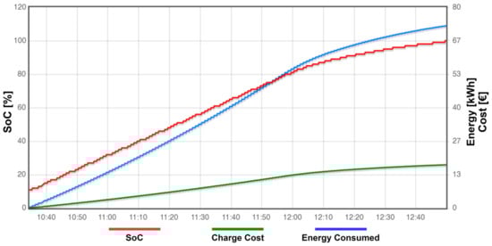 With the information in these graphs, it is possible to verify that the EV starts the charging emulation with a SoC of 10%, around 10:34 h and ends it, with a SoC of 100%, around 12:49 h. During these 2 h and 15 min, the EV charges 90% of its battery, with an energy transfer of approximately 72.7 kWh. This emulation was performed in a time period in which electricity had its highest cost (peak hours), so the 72.7 kWh was transferred from the electricity grid to the EV battery, resulting in a charging cost of 17.30 EUR, according to the tariff applied at the EVSE.