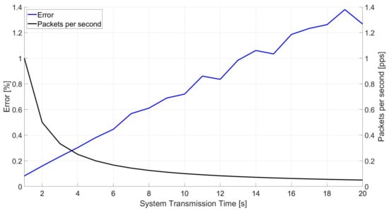 Power mismatch between charging and generation power. The blue line represents the percentual error between the generation power and the charging power, as the transmission periodicity is changed between 1 s and 20 s. The black line represents the rate of packets per second in the same conditions.