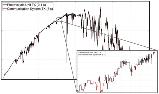 Considering a periodicity of communications between SECC and EVCC of 5 s, Figure 21 plots the difference between generation and charging levels. The values transmitted via the photovoltaic panel unit and the values transmitted between the communication controllers are very close throughout the daily sample. In light of these results, the utilization of the 5 s periodicity between transmissions in the setup for the task-scheduling algorithm is justified.
