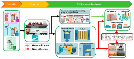 With the pressing need to address climate change, vigorously developing renewable and carbon-free energy sources has become paramount [1,2,3]. Energy carriers are crucial in balancing intermittent renewable energy production with ever-increasing demand [8,9]. For the mass transportation of hydrogen-containing fuels, liquefied forms of energy storage are preferred [10]. Liquid fuels, including liquid hydrogen or hydrogen-containing carriers such as ammonia (NH3), have gained traction in various applications [11,12]. Safe, reliable, and easily transportable energy is essential for achieving the “two-carbon” goals [13,14]. However, the lack of large-scale, reliable infrastructure hampers the efficient storage and transportation of hydrogen energy [15,16]. In contrast to hydrogen, NH3 energy boasts a well-established global infrastructure, a complete industrial chain for production, transportation, storage, and terminal applications, and favorable physical properties such as higher energy density [17]. These advantages position NH3 as a promising alternative to fossil fuels, with green NH3 production technologies further enhancing its appeal as a sustainable decarbonization fuel [18,19,20]. Moreover, NH3 exhibits superior safety compared to methane (CH4), hydrogen, liquefied petroleum gas, methanol, and gasoline [17,21]. As evident from Table 1, NH3 is emerging as a frontrunner for future renewable energy solutions [17,21,22,23]. Its cost-effectiveness, low carbon emissions, high efficiency, and safety make it a compelling choice to replace carbon-based energy sources. However, as NH3 energy gains recognition, it is crucial to closely monitor pollutant emissions and the far-reaching impacts of the nitrogen cycle on the global environment throughout NH3’s life cycle, from nitrogen synthesis to final decomposition [24,25,26]. NH3 fuel applications and emissions as shown in Figure 2.
