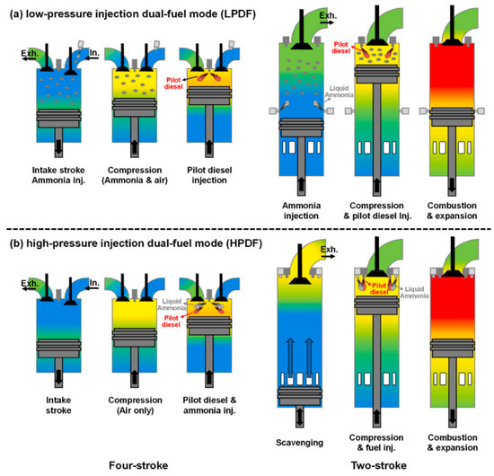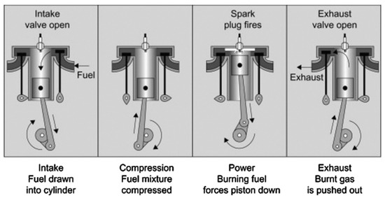 In SI engines, the fuel is compressed to the appropriate pressure and temperature for ignition through piston movement. High-energy spark plug injection ignites the fuel, causing it to expand and perform work, as illustrated in Figure 3. As a result, alternative fuels must have strong anti-knock properties and readily form a uniform mixture with air. NH3 possesses excellent anti-knock properties, making it a promising carbon-free green energy source for SI engines. However, the development of NH3 fuel in SI engines is hindered by its unfavorable physical properties. Several researchers, including Cornelius et al. [28], Starkman et al. [29,30], Cornelius et al. [22], Liu et al. [31], and Grannell et al. [32], have experimentally investigated NH3 as a fuel for SI engines. Their findings indicate that pure NH3 faces challenges such as inefficient flame propagation, difficult ignition, and unstable combustion, making it challenging to operate effectively in SI engines. Furthermore, NOx and unburned NH3 emissions are relatively high when using pure NH3.