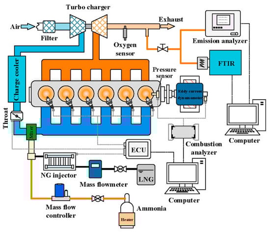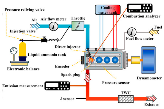 The schematic diagram of the ammonia and gasoline mixed-combustion test process [36].