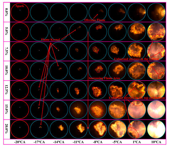Under high CRs of up to 13, the impact of adding H2 on the combustion characteristics of NH3 in a single-cylinder SI engine was analyzed. Additional H2 was found to worsen indicated thermal efficiency, as the high-temperature combustion of H2 resulted in significant heat transfer loss [48]. The visualization of combustion further revealed a critical threshold for the energy ratio between H2 and NH3. High-speed flame images depicting different H2/NH3 mixing ratios are shown in Figure 6. The addition of H2 to the air–NH3 mixture enhanced combustion speed, with optimal ratios being more dependent on engine load rather than speed. The NH3/H2 mixture was introduced into the intake manifold of a two-cylinder, four-stroke, low-speed marine engine. Experimental results [49] revealed that a minimum energy ratio of approximately XH2 = 7% was necessary for the engine to operate reliably at full load, while a ratio of 11% was required at half load. A proposed method involving the ignition of NH3 with an H2 jet flame successfully achieved full-load power output for the SI engine [49].