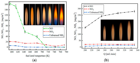 The emissions with different preheating temperatures (a) and NH3 flow rates (b) [55].