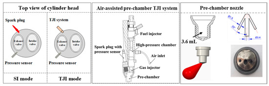 Increasing the number of spark plugs effectively reduces NOx emissions while enhancing flame propagation speed. Uddeen et al. [69] modified the existing engine ignition system to equip it with four spark plugs, which showed that multi-spark-plug ignition promotes flame propagation, shortens the initial flame retention time, and improves the pure NH3 combustion rate. However, it increases in-cylinder pressure and temperature, creating an unfavorable environment for NOx formation. To enhance combustion performance, Liu et al. [70] employed pre-chamber turbulent jet ignition (TJI) technology on a 0.5 L, one-cylinder, four-stroke SI engine with a CR of 14, as shown in Figure 8. TJI generates turbulent jet flames, enabling multi-point ignition and stable combustion for low-reactivity fuel mixtures in the combustion chamber [70]. Adopting the TJI mode shortens combustion time and delays ignition time owing to an increase in ignition energy, which is beneficial to improving the combustion stability of the NH3 SI and increasing the combustion rate. Regardless of the ignition method, the NOx and NH3 emissions of NH3 SI engines are higher [70].