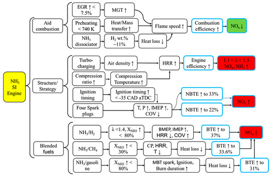 In summary, the pathways to enhance combustion and reduce emissions in NH3 SI engines are illustrated in Figure 9. The addition of other fuels results in a significant increase in flame propagation speed, a reduction in the flame stagnation time during the initial stage of combustion, and a notable improvement in BTE. However, this comes at the cost of a substantial increase in fuel–NOx emissions. Altering the structure of an SI engine or adjusting fuel injection or ignition timing can effectively raise pressure and temperature in the cylinder, leading to a significant upward trend in engine BTE. Nevertheless, NOx emissions and NH3 slip are not satisfactorily addressed. The incorporation of auxiliary combustion technology proves effective in enhancing NH3 combustion efficiency and consequently reducing NOx emissions.