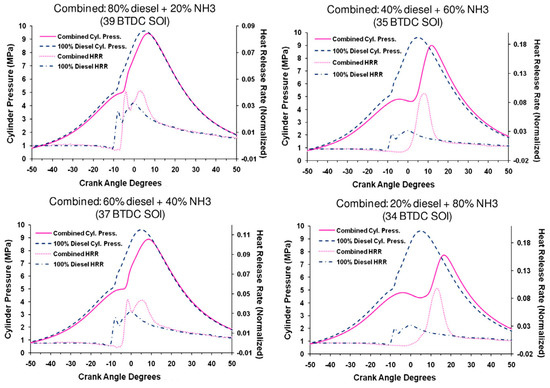 NH3 has the most significant impact on improving the ignition delay period of diesel, while it has the smallest effect on improving Pmax and efficiency. Several potential strategies for using NH3 as a CI fuel include (a) blended fuel combustion [79], (b) high CR [80], and (c) injection strategies [81,82]. Overcoming the combustion challenges of NH3 fuel often requires a combination of these measures. An effective strategy to enhance the combustion performance of NH3 is to blend it with a more reactive fuel. Similar to SI engines, if the auto-ignition temperature of the fuel is higher than the cylinder temperature at the end of compression, it can be mixed with NH3 fuel and injected into the combustion chamber of the CI engine to mitigate the defects in the physical characteristics of NH3 fuel. The engine’s performance during combustion heavily depends on the cetane number (CN) of the mixed fuel, where a higher CN results in optimal performance with shorter ignition delays and optimum combustion efficiencies.