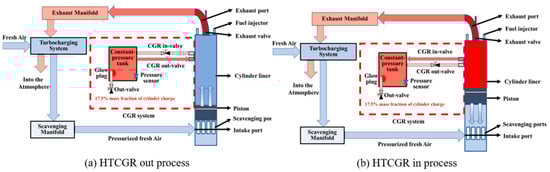 Numerical simulation results have successfully validated the feasibility of the new high-temperature cylinder gas recirculation (HTCGR) technology [88]. The new HTCGR technology as shown in Figure 12. Consequently, it is crucial to investigate the impact of mixing combustion-generated water with NH3 on engine combustion and emissions. Frost et al. [90] conducted combined numerical analysis and experimental research to explore the effects of different concentrations of NH4OH (ammonium hydroxide) on CI combustion under various workloads. At an IMEP of 4 bar, although the ignition delay time is longer than that of pure diesel, NH3 can be ignited and contribute 25% of the engine load. Increasing NH4OH concentration increases NOx emissions, as the elevated cylinder temperature during this stage is closely related to NOx emissions. After continuously increasing NH4OH concentration and contributing 20% to the engine load, NOx levels decrease. Excessive NH3 concentration increases combustion instability and lowers the in-cylinder temperature [91]. These findings align with results in the literature [92], where the addition of a NH3 solution reduces combustion pressure and HRR, increases engine diameter and ignition delay, reduces engine performance, and significantly decreases NOx emissions.