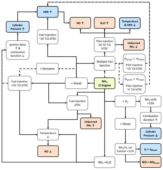 Building on these research results [61,99], Wang et al. [100,101] conducted a more detailed study on the influence of the NH3/H2 energy ratio on the pressure in the engine cylinder, power, and emissions. Mixing H2 from 0 to 30% increased the cylinder explosion pressure by 10.7% and power by 1.8% while reducing the fuel consumption rate and NH3 escape by 0.3% and 99.1%, respectively. Although NOx emissions increased by 58.8%, the comprehensive performance of the CI engine after H2 mixing combustion was improved. With the help of a small amount of diesel ignition, the engine adopted a direct injection method, and when using a mixture of NH3 and H2 as fuel, the optimal XH2 was found to be 30% [101]. Pathways to promote combustion and emission reduction in NH3 CI engines as shown in Figure 13.