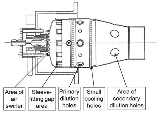 The combustion chamber of the GT exhibits distinctive features. These include high temperatures, elevated airflow velocity (leading to unstable flames that are prone to extinguishing, making combustion completion challenging), heightened combustion intensity (requiring a large fuel supply per unit volume and high combustion speed, necessitating a uniform outlet temperature field), and a high excess coefficient. The latter is particularly notable in areas of poor combustion, where working conditions are variable. These characteristics are illustrated in Figure 15.