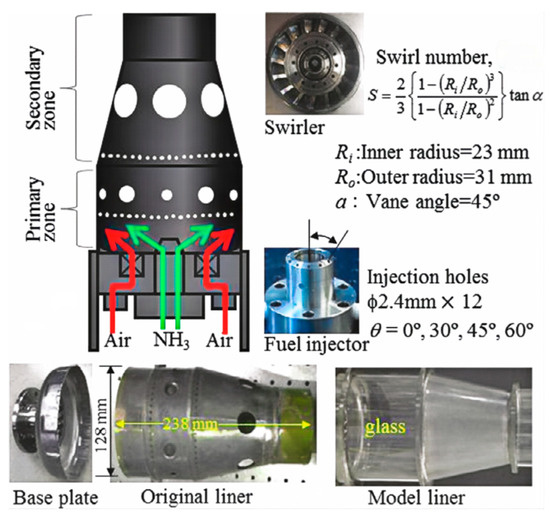- Somarathne, K.D.K.A.; Okafor, E.C.; Hayakawa, A.; Kudo, T.; Kurata, O.; Iki, N.; Kobayashi, H. Emission characteristics of turbulent non-premixed ammonia/air and methane/air swirl flames through a rich-lean combustor under various wall thermal boundary conditions at high pressure. Combust. Flame 2019, 210, 247–261. [Google Scholar] [CrossRef]