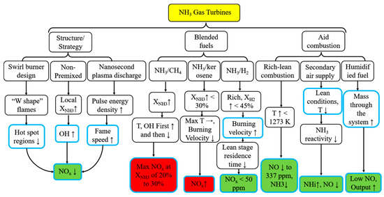 - Okafor, E.C.; Somarathne, K.K.A.; Ratthanan, R.; Hayakawa, A.; Kudo, T.; Kurata, O.; Iki, N.; Tsujimura, T.; Furutani, H.; Kobayashi, H. Control of NOx and other emissions in micro gas turbine combustors fuelled with mixtures of methane and ammonia. Combust. Flame 2020, 211, 406–416. [Google Scholar] [CrossRef]