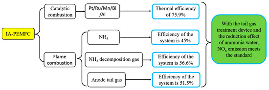 Utilizing alternative energy sources through minor modifications in carbonaceous energy-powered equipment presents a rapid and cost-effective approach to developing NH3 energy [28]. However, NH3 combustion faces challenges such as ignition difficulties, slow flame propagation, and instability. Additionally, a low heat release rate (HRR) and high NOx emissions hinder the widespread use of NH3 in power equipment. NH3 also serves as an effective hydrogen carrier, enabling the decomposition of NH3 to generate hydrogen as a green energy source. Simultaneously, NH3 fuel can participate in FC reactions to produce a stream of electrons, generating electricity [8]. However, NH3’s weak reaction kinetics and slow chemical reaction rate limit its power output and hinder its broader application in fuel cells (FCs) [17]. Mixing NH3 with fuels with higher reactivity can effectively improve its combustion rate. Other measures, such as structural adjustments, strategic optimization, and auxiliary combustion technologies, have also yielded promising results in enhancing NH3 combustion [17].