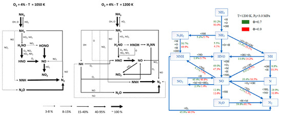 - Bykov, V.; Stein, M.; Maas, U. Study of mechanism of ammonia decomposition and oxidation: From NOx reduction to ammonia auto-ignition problem. Proc. Combust. Inst. 2023, 39, 4267–4275. [Google Scholar] [CrossRef]