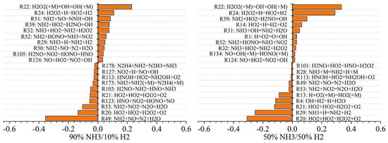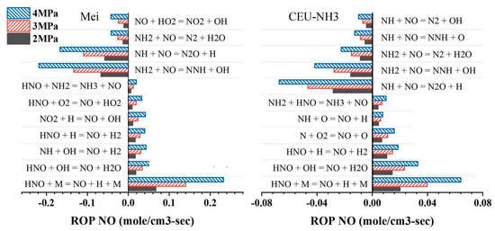 Blending NH3 leads to a deterioration in NOx emissions due to fuel–NOx formation. However, the sensitivity of NOx emissions to the NH3 blending ratio is generally moderate, and the trend of NOx emissions with the ignition advance angle is opposite to that of pure gasoline, indicating that fuel–NOx emission is strongly correlated with in-cylinder pressure [37]. Under high CR test conditions, Westlye et al. [38] found that NOx was primarily produced during gap volume combustion and observed that NO emission levels were similar to those observed in gasoline measurements when the excess air coefficient (λ) is 1, mainly due to a lower flame temperature. The simulation involving the mechanism model revealed that the reaction between NH2 and NO2, as well as NH and NO, significantly influences the magnitude of this reaction, which is strongly influenced by the timing of ignition.