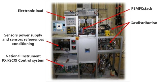 The fuel cell aging test/experimental data used in this paper were sourced from the IEEE 2014 Data Challenge [28]. The testing system used is shown in Figure 1, and both fuel cell stacks used in the test are composed of five single cells. Each cell has an active area of 100 . The PEMFC stack is assembled with commercial membranes, gas diffusion layers, and machined flow distribution plates. The nominal current density of the cells is 0.7 , and the maximum current density is 1 .