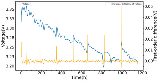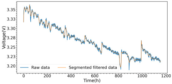 Since the performance degradation of fuel cells is a long-term process, the original voltage data were resampled at intervals of 1 h. Meanwhile, filtering is required to remove noise from the signal. However, if global filtering is performed directly, the signal near the moment when the recovery of the reversible voltage loss takes place will be improperly changed. Therefore, this paper uses the recovery time as the boundary point to perform segmented filtering on the signal. The Savitzky–Golay method was adopted for the filtering process, with a sliding window length of 20 h, and cubic function was selected as the fitting function. The results are shown in Figure 3.