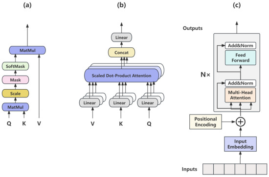The structure of the Transformer encoder is shown in Figure 4c, and its core structure, the multi-head self-attention mechanism, is shown in Figure 4b. The concatenated multiple self-attention calculation results are shown in Figure 4a. The self-attention calculation formula is as follows: