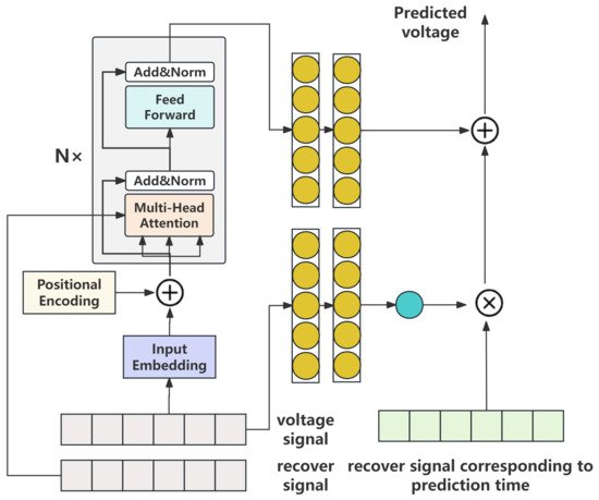 The final design model of this paper is shown in Figure 6. The voltage is adopted as the input for the encoder after embedding and position encoding. The voltage recovery information corresponding to the input voltage is used to generate a mask and the output is passed into the multi-head attention structure inside the decoder. Since the phenomenon for recovery of the reversible voltage loss is a human intervention operation, it should be employed as input to the model. Meanwhile, to enable the linear layer to learn the voltage recovery value, the voltage data are directly passed through the linear layer. The output of the Transformer encoder is also added to the voltage recovery through the linear layer to obtain the final output.