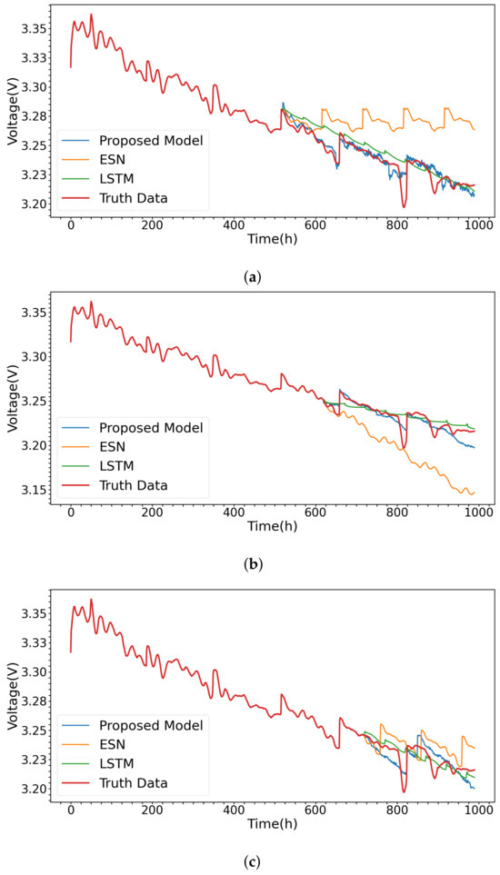 When predicting from 720 h onwards, the prediction errors of the three models basically decrease as the content of the dataset is enriched. The RMSE, MAE, and MAPE of the LSTM model are 0.009, 0.006, and 0.002, respectively. The RMSE, MAE, and MAPE of the proposed model are 0, 0.008, 0.007, and 0.002, respectively. The above-mentioned errors still remain lower than the prediction errors of ESN. In Figure 8c, the fuel cell voltage performance deteriorates sharply around 800h. The accurate prediction for this situation is of great significance for the health management of fuel cells [30]. It is found that only the model proposed in this paper predicts this sharp decline result accurately.