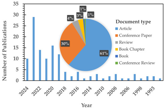 To explore the literature on flexibility and energy, we searched the Scopus database using the query (TITLE-ABS-KEY (“Energy* and flexibility*”) and retrieved all documents up to 28 May 2024 (Figure 1). A total of 124 documents were retrieved, with most (61.3%) being article papers and 29.8% being conference papers. From the figure, it is evident that there is increased interest in implementing flexibility mechanisms in the energy sector. This trend has strongly grown especially in the last four years, peaking in 2023.