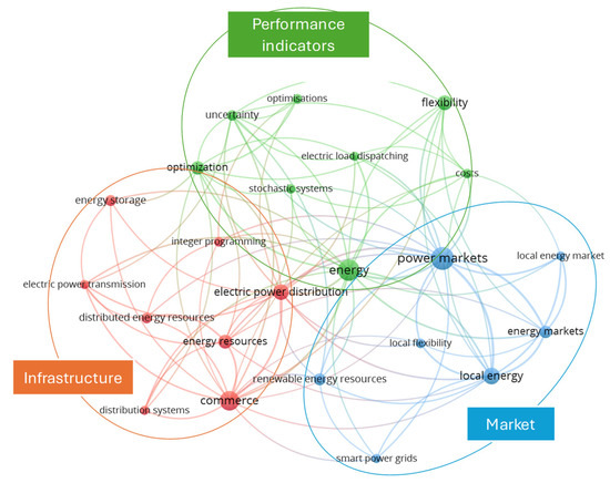 In the context of the market cluster, keywords such as “energy markets”, “local energy”, “local energy market”, “power markets”, etc., are evident. Renewable energy resources also take part in this cluster, showing a close connection between the evolving energy landscape’s necessity for flexibility to manage the variability of renewable energy sources and ensuring grid stability. In context, there are also efforts to adapt energy markets and policies to support flexible technologies, such as energy storage and smart grids [14]. Local energy systems, including microgrids, enhance resilience and adaptability [15]. As renewable energy integration increases, mechanisms like demand response and time-of-use pricing become vital [16].