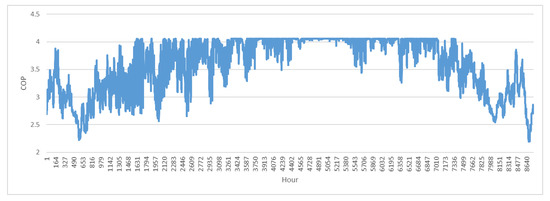 Hourly coefficient of performance (COP) for air-supplied heat pumps in Germany in 2014.