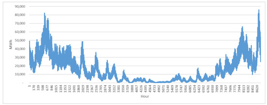 Hourly electricity demand in megawatt hours (MWh) for air-supplied heat pumps (household sector) in Germany in 2014, assuming that the total heat demand is satisfied by this technology.