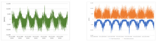 If we average the COP values from Figure 1 (although being not perfect and a rather positive estimate), we yield an annual average COP of 3.5. For the sake of simplicity, we assume that this COP holds for all 6 million heat pumps. According to the Federal Statistical Office of Germany (Destatis), an average household consumes 17,644 kWh of energy, 85% of which is for air/floor heating and warm water [16]. This means we have a heat pump-related energy demand of 15 MWh × 6,000,000/3.5 = 25.714 TWh. Extending Figure 2 to the period from 2008 to 2014, we compare the heat pump demand to the hourly production of renewable energy. We see, not unexpectedly, that the power demand is highly seasonal, with a peak between November and February, the usual heating months. In Figure 3 (right side), we show the simulated heat pump demand profile vs. the renewable energy production if we assume that the additional demand is installed in a way that demand can be supplied by renewables—on an annual level—even in the worst year of our historic data. To compare the profiles, we show the renewable production as negative numbers in the sense that supply is negative demand. The requirement of structuring is obvious. We also show the residual demand in Figure 3 (left side), which shows that there is a significant overproduction in summer due to the solar power share.