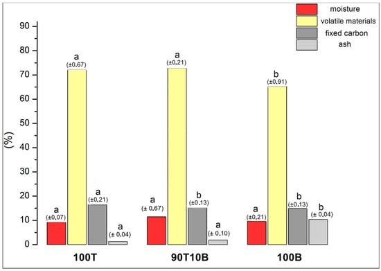 According to the data obtained in the immediate chemical analysis, the percentage moisture contents were 9.56% for the 100T composition, 10.26% for 90T10B and 9.83% for 100B. The values found, according to the literature, are close to the biomass expected to be used for energy use in relation to the compaction of the material, in which moisture should be between 8 and 15% [50,54,55]. Moisture is a parameter used to qualify the biomass that mainly influences the calorific value of the material because it reduces the mass fraction of carbonaceous compounds and, consequently, reduces the heat capacity, causing greater endothermy in the process that involves burning the material, mainly in cases of large volumes of biomass. Therefore, this influences production costs and leads to a loss of useful energy [36,55,56,57].