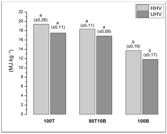 HHV and UHV of compositions 100T, 90T10B and 100B. Equal letters in superscript indicate statistical equality according to the Tukey test.