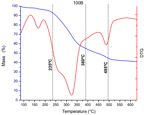 In composition 100B, there were also two phases of degradation. The first phase is between 235 °C and 380 °C; this phase is shorter than in compositions 100T and 90T10B. The fact that this phase began at a higher temperature than the previous compositions is due to the high content of extractives, which, according to chemical characterization, was the highest among the analyzed compositions. In this phase, there was a 38% mass loss. The second phase of degradation occurred between temperatures of 380 °C and 495 °C, with 13% of mass loss. This composition presented the highest degradation temperature compared to the compositions 100T and 90T10B. This was probably due to the greater amount of extractives to be degraded and mainly due to the inorganic fraction contained in the material, which, due to its high specific heat, absorbs more heat and slows its transfer in the direction of carbonaceous compounds [113,114].