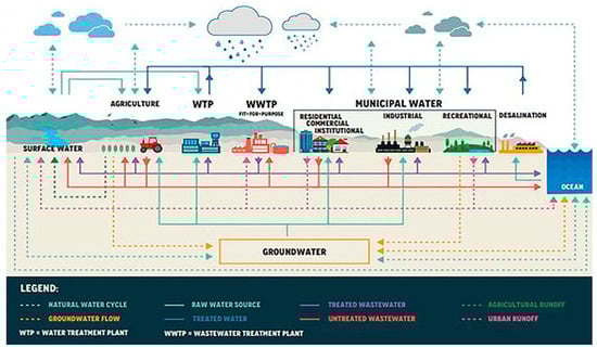 Initially, these facilities were focused on basic sedimentation processes to eliminate solids from wastewater. However, the emphasis shifted towards sophisticated methods of removing physical, biological, and chemical pollutants to protect water resources and comply with stringent environmental regulations as environmental awareness has increased and technology has advanced in recent times [14,19]. Today, modern WWTPs incorporate a range of processes, including primary, secondary, and tertiary treatments, along with advanced filtration and disinfection techniques [20]. The traditional energy patterns in WWT reflect an approach that is exclusively focused on meeting treatment objectives rather than energy efficiency or sustainability. The lack of emphasis on energy recovery or the integration of sustainable practices further underscores the energy-intensive nature of historical WWT operations, highlighting a critical area for improvement in the quest for highly sustainable and energy-efficient water management practices [9]. The concept of water reuse has attracted significant attention in recent years as a sustainable approach to wastewater management. Water reuse involves treating wastewater to a level that allows it to be safely used for various purposes such as agricultural irrigation and industrial processes and even as potable water after undergoing advanced purification processes [21]. As an integral part of the water cycle, wastewater should be properly managed throughout the entire water management process, including freshwater abstraction, treatment, distribution, usage, collection, post-treatment, reuse, and its final return to the environment. This practice not only helps in conserving freshwater resources but also reduces the environmental impact of wastewater discharge, as depicted in Figure 2, where municipal wastewater is a constituent in the water cycle [22]. Recent advancements in water reuse technologies have shown promising results. Membrane bioreactors (MBRs) combined with advanced oxidation processes can significantly reduce pathogens and emerging contaminants, making the treated water safe for various reuse applications. Recent studies have highlighted the effectiveness of MBRs in producing high-quality effluent suitable for reuse, with COD removal of more than 90% [21].