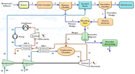 An energy recovery configuration for a wastewater treatment plant. Reproduced with permission from Erguvan and MacPhee (2021) [66], ©MDPI, 2021, CC BY 4.0 (open access).