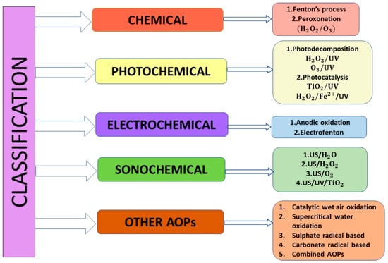 Oxidation in AOPs can be due to four main processes, namely chemical (using catalysts and chemicals), photochemical (using sunlight and sources of ultraviolet light), electrochemical (using sources of electricity), and sonochemical (using ultrasound) processes. These processes serve as the basis for the four main classifications of advanced oxidation processes. However, there have been recent advancements in these processes that have led to other types of AOPs, such as supercritical water oxidation, catalytic wet air oxidation, and processes based on carbonate and sulfur radicals. There also exist combinations of AOPs with great potency for the removal of toxins from wastewater [90].