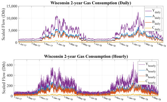 Using the scenario presented in Figure 1, an LDC was partitioned into three operating areas, , , and , and into hourly and daily forecast frequencies. Figure 2 shows the observed series at each of these frequencies, including the aggregated hourly and daily LDC total series and .