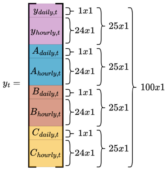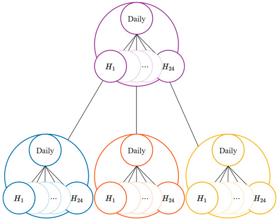 The observations shown in Figure 2 are measured at times , with representing the total number of observations in a single series at the lowest hierarchical level. For our new cross-temporal hierarchy, let be the total number of series at the most disaggregated level (24 h × 3 operating areas) and be the total number of nodes within our cross-temporal hierarchy. The hierarchical time series, , is an -vector containing all observations made at time .
