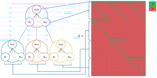 Figure 3a illustrates the spatial structure for operating areas , , and . The right side shows the temporal structure with daily demand aggregated from hourly demand. Let the number of nodes in each hierarchy be represented by scalar , and the number of nodes at the lowest hierarchical level available be . We converted each hierarchy in Figure 3 into its summation matrix to form of size Let and be the summation matrices for the spatial and temporal hierarchies illustrated in Figure 3, respectively: