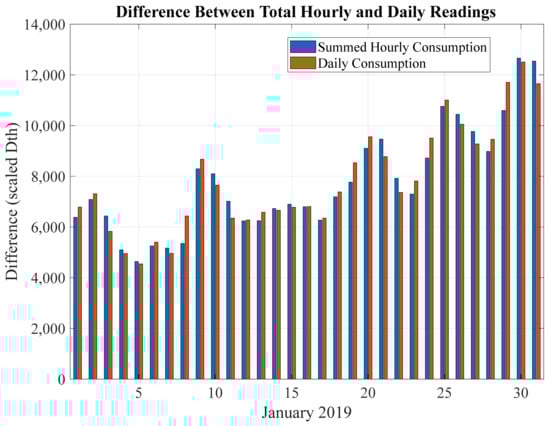 All published hierarchical forecasting techniques assume an underlying coherence is present in the training data. As summarized in the literature review (Section 2), numerous researchers have found success in reconciling forecasts using coherence theory-driven optimal combination methods. A particular challenge faced in this work is that the underlying data used to train the base models are not coherent. Figure 7 illustrates this incoherence between the summed hourly demand and daily demand for a sample month (January 2019).