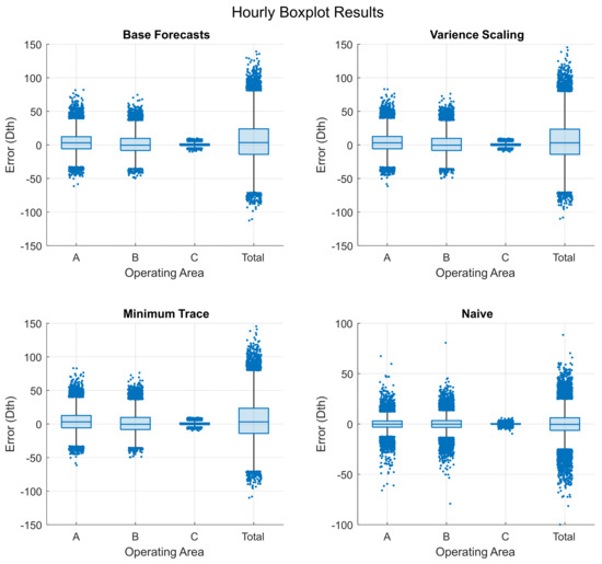 Hourly box plot results for the error distribution across different operating areas, comparing each reconciliation method (variance scaling, minimum trace, and naïve).